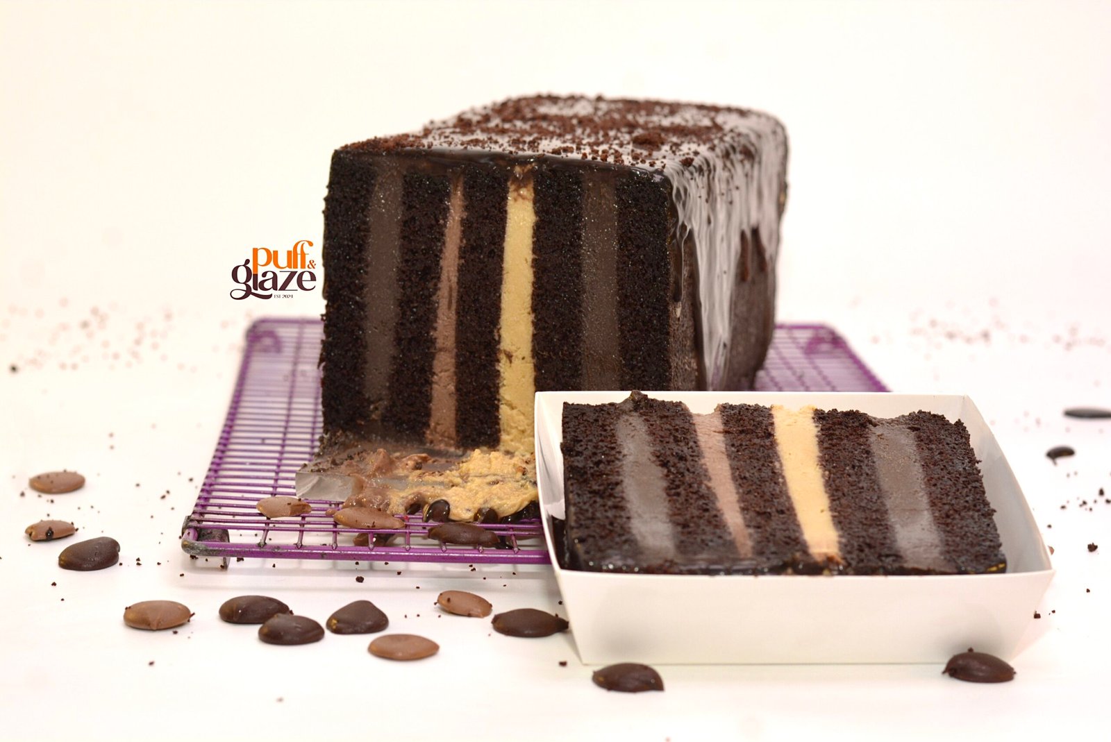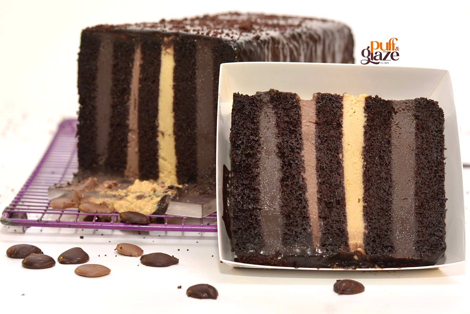 A moist chocolate layers of cake filled with milk chocolate mousse, dark chocolate mousse, caramel mousse and topped with chocolate ganache.
