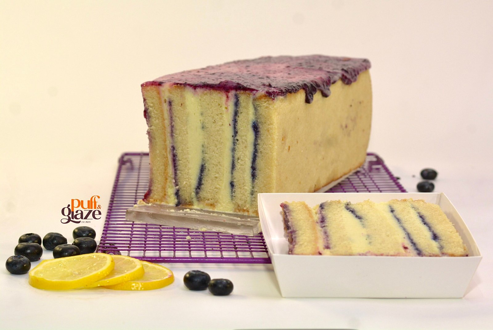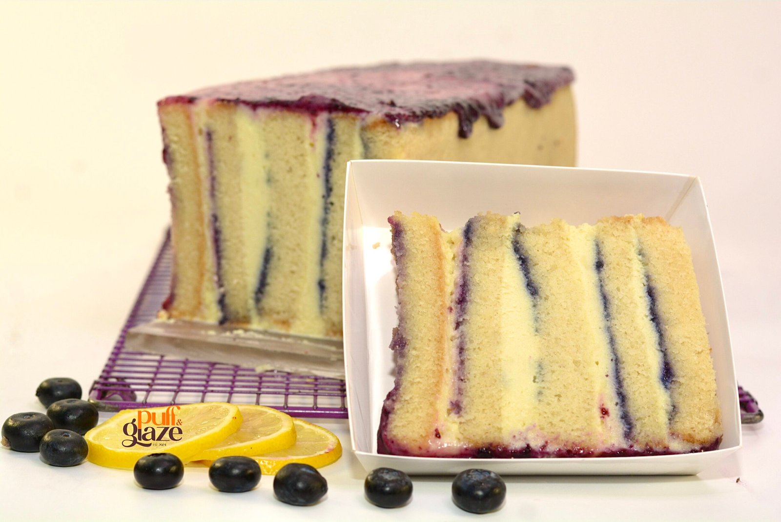 A rich moist butter vanilla cake filled with alternating filling layers of Zesty Lemon curd and Blueberry Coulis, layered with Swiss buttercream and vanilla mousse topped with lemon curd and blueberry sauce.