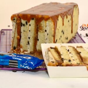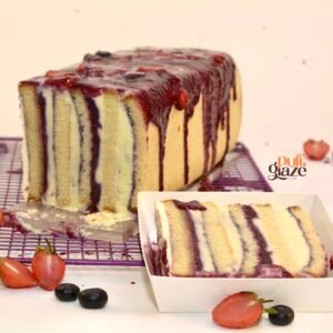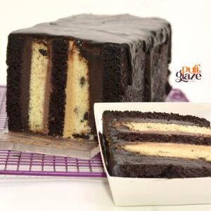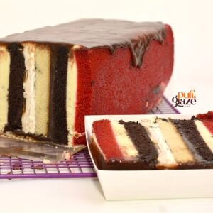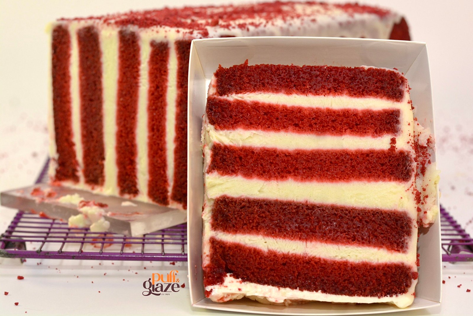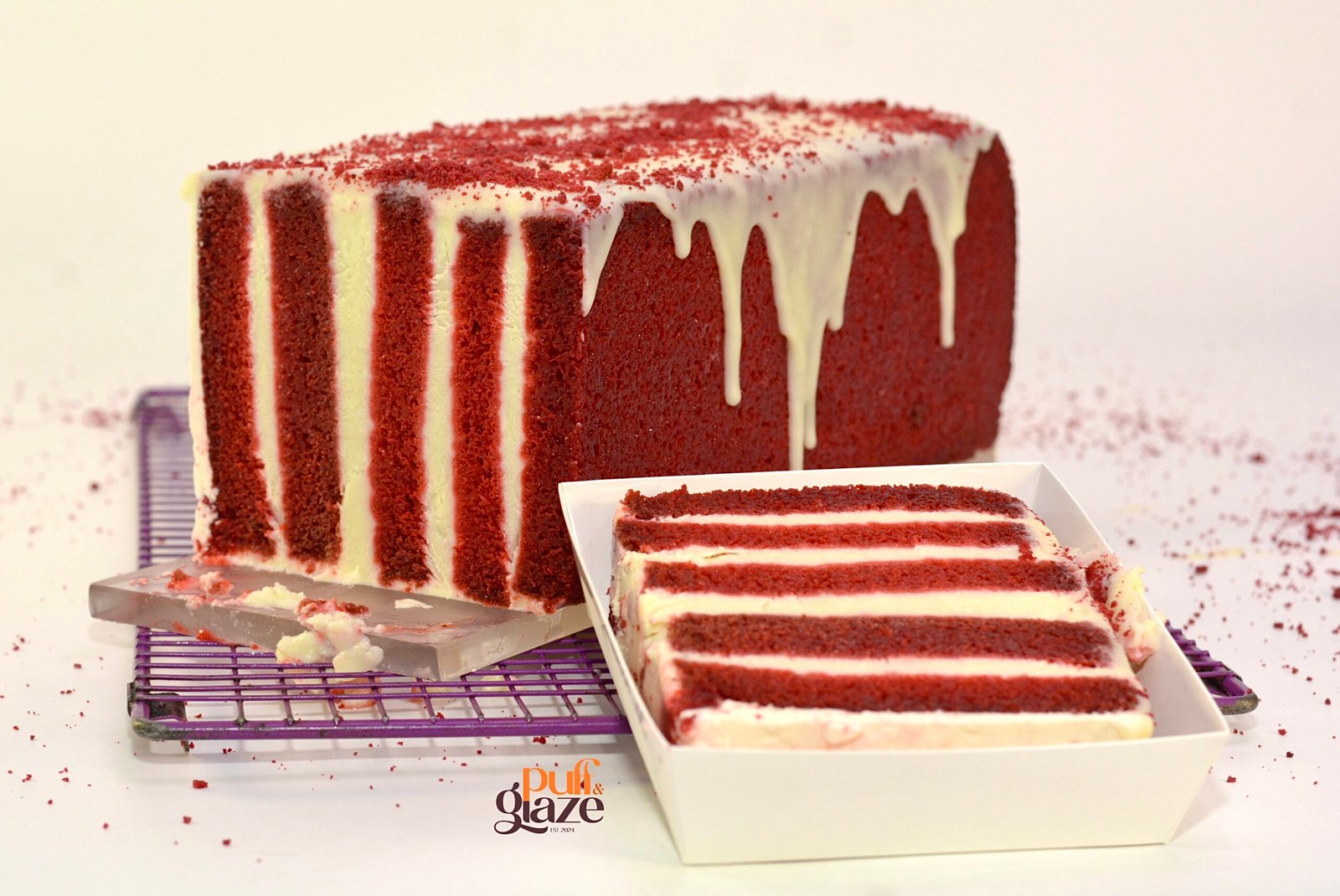A moist Red Velvet cake filled with cream cheese frosting topped with white chocolate glaze.