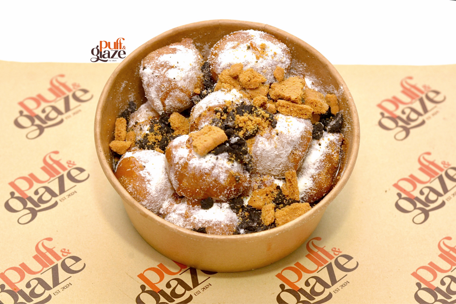 These little bites of perfection are made from a soft dough. Deep fried until golden brown and the drizzled with caramel, with sprinkles of milk powder and chunkys of Lotus biscuit and Oreo cookies.